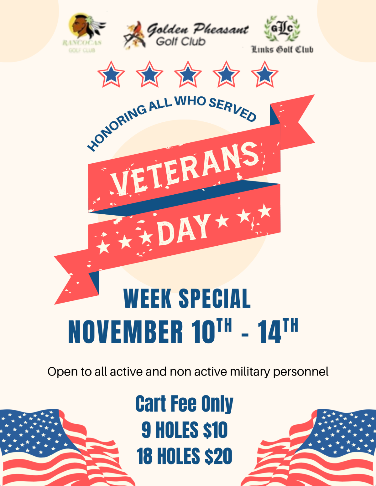 November 7, 2025 – In honor of Veteran’s Day, Rancocas Golf Club, Links Golf Club, and Golden Pheasant Golf Club are delighted to offer you an exclusive golfing experience: